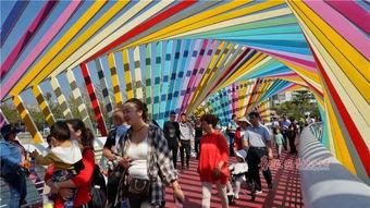 白天,彩虹桥上的游客络绎不绝。阳光透过桥上的彩带,洒在人们的脸上,显得格外温暖。此时,你可以看到桥上的人们或拍照留念,或悠闲地散步,享受着这美好的时光。